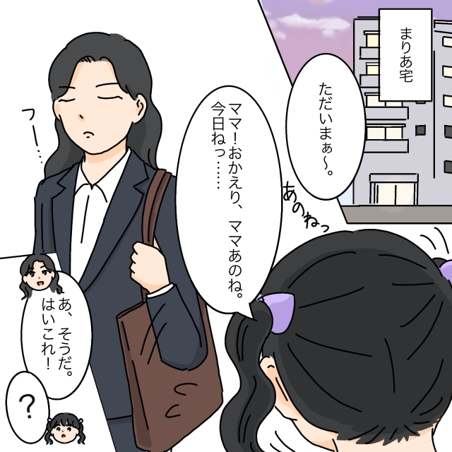 まりあちゃんの家では、お母さんが仕事から疲れた様子で帰って来ました。お母さんの顔を見て「ママ!おかえり、ママあのね。今日ねっ・・」と話したいことがたくさんあるまりあちゃんですが、お母さんはまりあちゃんの話にはあまり興味を示さず「あ、そうだ。はいこれ!」と言ってカバンから何かを取り出しました。