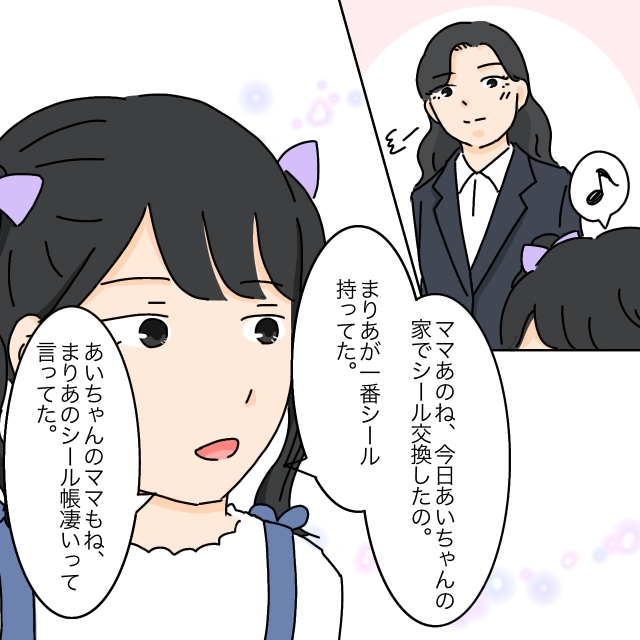 まりあちゃんは「ママあのね、今日あいちゃんの家でシール交換したの。まりあが一番シール持ってた。あいちゃんのママもね、まりあのシール帳すごいって言ってた」とお母さんに得意げに話します。