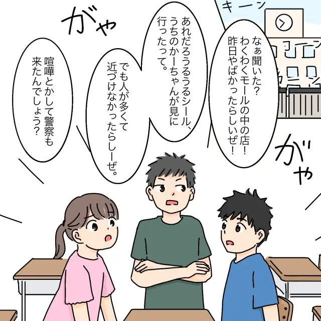 「なぁ聞いた?わくわくモールの中の店!昨日やばかったらしいぜ!」「あれだろ、うるうるシール、うちのかーちゃんが見に行ったって。でも人が多くて近づけなかったらしいぜ」と学校の中はうるうるシールの話で持ち切り。「喧嘩とかして警察も来たんでしょう?」となんだか物騒な話をしていました。