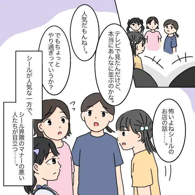 クラスの中であいちゃんたちのグループにもその話が聞こえてくると、「怖いよねシールのお店の話・・」と一人がそう言いました。「テレビで見たんだけど、本当にあんなに並ぶのかな」「人気だもんね~」「でもちょっとやり過ぎっていうか?」とみんな口々に言いました。そう、シールが人気にな一方で、シール界隈のマナーの悪い人たちが目立っていたのでした。