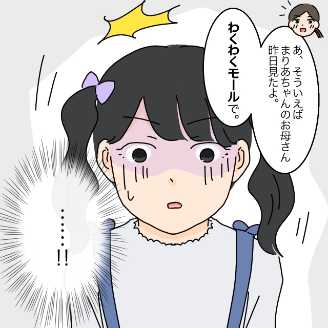 すると、「あ、そういえばまりあちゃんのお母さん昨日見たよ。わくわくモールで」と友達の一人に言われ「・・・!!」まりあちゃんは言葉を失いました。