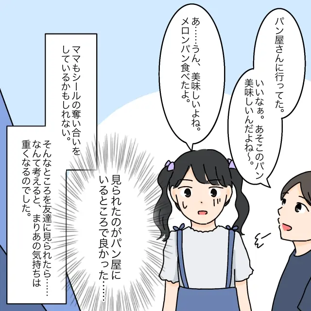「パン屋さんに行ってた。いいなぁ。あそこのパン美味しいんだよね~」友だちの言葉にホッとしたまりあちゃんは「あ・・うん、美味しいよね。メロンパン食べたよ」と答えつつ、「見られたのがパン屋にいるところで良かった・・」と心の中で呟きました。