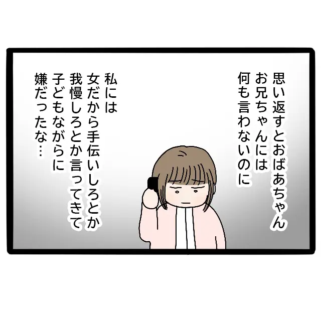 よっちゃんから母の過去を聞いた私は、ふと自分の幼い頃を思い出しました。確かに祖母は、兄には何も言わないのに、私にだけ「女だから手伝いしろ」とか「我慢しろ」とか言ってきて、子ども心にその扱いがとても嫌だったことを覚えています。今になって振り返ると、あれは跡取りである兄だけが可愛かったからなのでしょう。