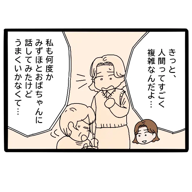 ショックを受ける私に、よっちゃんは「きっと、人間ってすごく複雑なんだよ・・・私も何度かみずほとおばちゃんに話してみたけど、うまくいかなくて」と言ってくれました。よっちゃんもみずほ先輩のことを心配して、母に何度か取り合ってくれたようです。けれど、母はその声に耳を傾けることはなかったようでした。