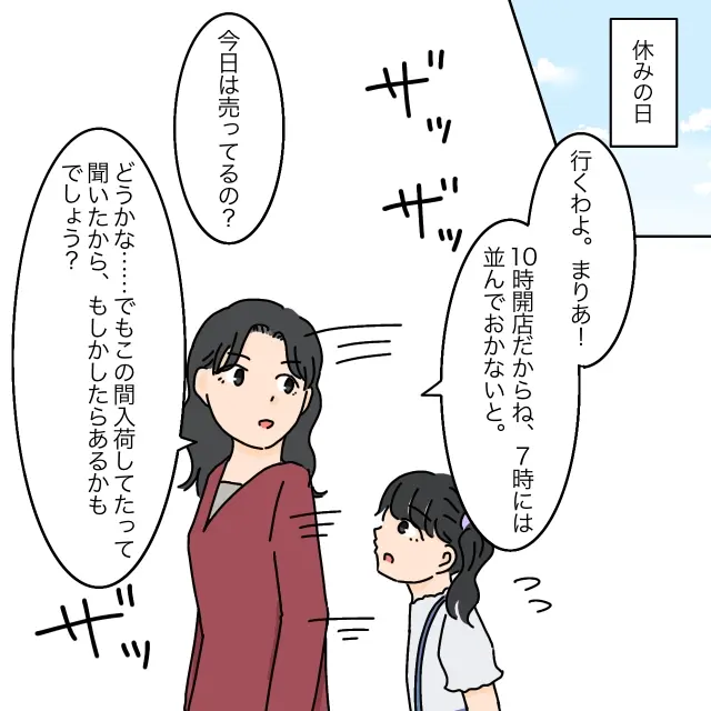 ある休みの日。「行くわよ。まりあ!10時開店だからね、7時には並んでおかないと」とまりあちゃんはお母さんのあやかさんに連れられ朝早くに家を出ました。足早に歩くあやかさんに必死について行きながら「今日は売ってるの?」とまりあちゃんが聞くと、「どうかな・・でもこの間入荷してたって聞いたから、もしかしたらあるかもでしょう?」と足を止めずに答えるお母さん。数日前にシールが売っていたというお店の情報を耳にしたお母さんは、シールを買うために早朝からまりあちゃんを連れてそのお店に向かっていたのです。