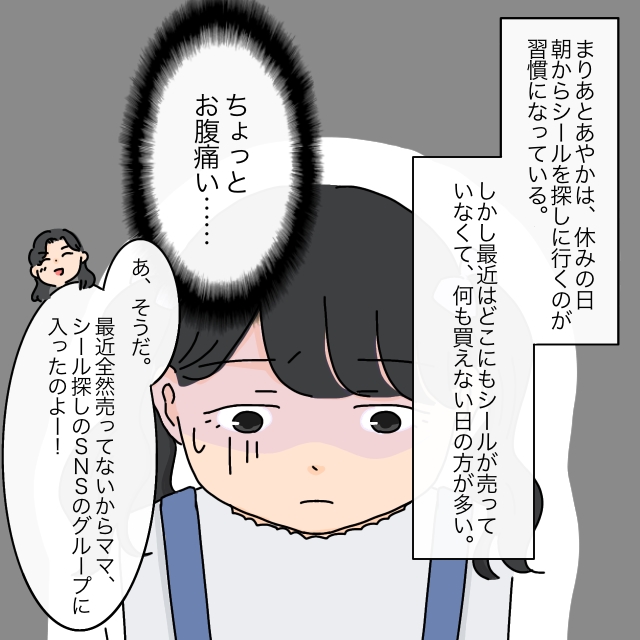 まりあちゃんとあやかさんは、休みの日は朝からシールを探しに行くのが習慣になっていました。しかし、最近はどこにもシールが売っていなくて、開店前から並んでも何も買えない日の方が多くなっていました。この日、家を出た後に少しお腹が痛いと感じていたまりあちゃんですが、意気込んでいるあやかさんに言い出せずにいました。まりあちゃんの腹痛に気づかないあやかさんは「あ、そうだ。最近全然売ってないから、ママ、シール探しのSNSグループに入ったのよー!」と得意げに話します。
