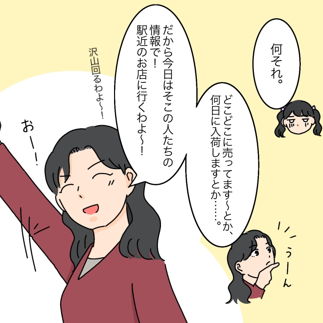 「何それ」とまりあちゃんに聞かれたあやかさんは「どこどこに売ってます~とか、何日に入荷しますとか・・」と簡単に説明すると、「だから今日はそこの人たちの情報で!駅近のお店に行くわよ~!たくさん回るわよ~!おー!」とやる気満々。