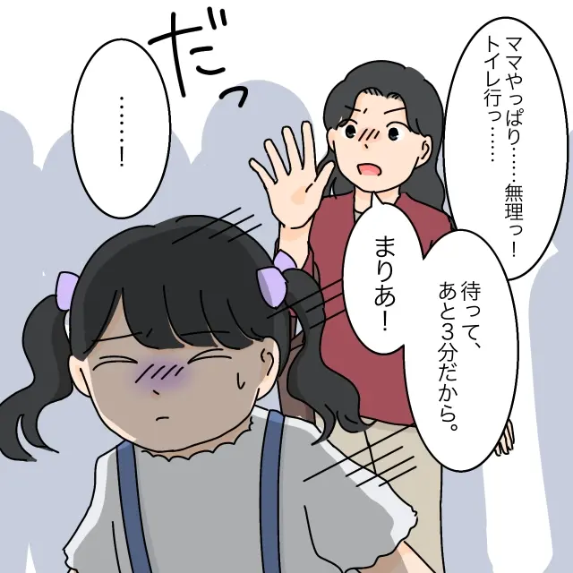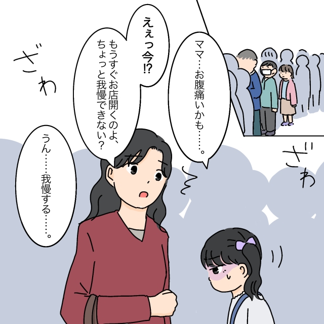 2人が目当てのお店に着いたときにはすでに行列ができていました。列に並び始めてしばらく経ったとき、腹痛に耐えられなくなったまりあちゃんは「ママ・・お腹痛いかも・・」とようやく打ち明けました。しかし、開店時間が迫っているタイミングで「えぇっ今!?もうすぐお店開くのよ、ちょっと我慢できない?」とお母さんに言われ「うん・・我慢する・・」とトイレに行くのを我慢することにしたまりあちゃん。