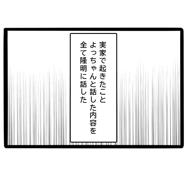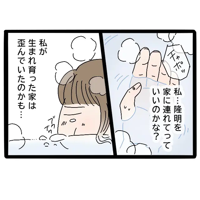 よっちゃんから母の過去を聞かされた私は、隆明を実家に連れて行っていいものか悩みました。私の生まれ育った家は歪んでいるのかもしれない。そう思うと、隆明に「自慢の家族」だと胸を張って紹介することが、どうしてもできません。