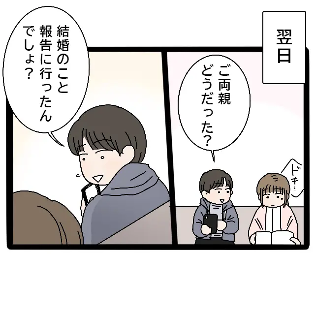 そして翌朝。隆明から「ご両親どうだった?結婚のこと報告に行ったんでしょ?」と聞かれ、私は思わずドキッとします。みずほ先輩が母から嫁いびりを受けていることを隠すべきなのか、それともこれから家族になる相手だからこそ正直に伝えるべきなのか。頭の中で考えがぐるぐると巡るばかりで、言葉が見つかりません。