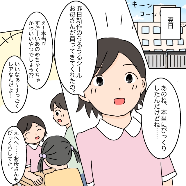 翌日、小学校でのこと。「本当にびっくりしたんだけどね・・・昨日新作のうるうるシール、お母さんが買ってきてくれたの」念願のうるうるシールを手に入れられた嬉しさから、あいは昨日の出来事をさっそく友達に話しました。それを聞いた友達は「すごーい!あのめちゃくちゃ可愛いやつでしょ?」「いいなぁ~!すっごくレアなんだよ!」と目を輝かせます。