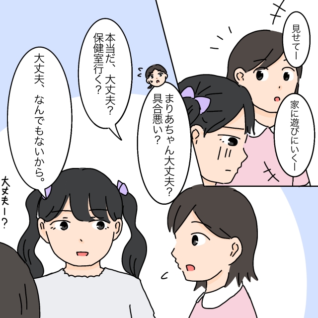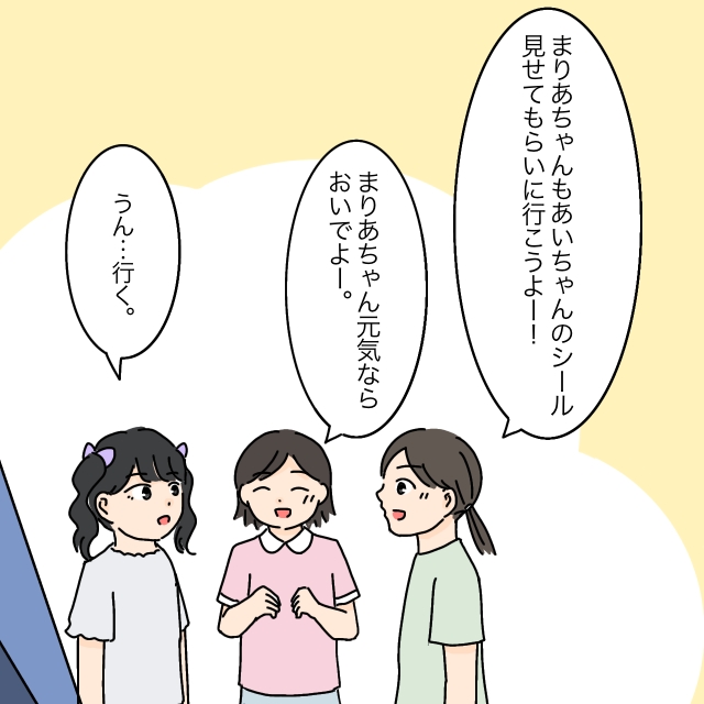 すると友達の1人が、「まりあちゃんも、あいちゃんのシール見せてもらいに行こうよ!」と提案しました。あいも自慢のうるうるシールを見てもらいたいようで「まりあちゃんも元気ならおいでよ」と声をかけます。まりあちゃんは一瞬だけ迷うような表情を浮かべましたが、「うん・・・行く」と答えたのでした。