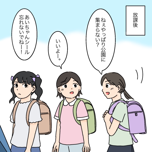 そして放課後。当初はあいの家に集まる予定でしたが、友達のひと言で行き先は公園に変更。あいは一度自宅に戻ってシールを取りに行き、そのまま公園に向かうことになりました。