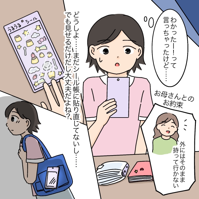 自宅に戻ったあいは、どうしたものかと悩んでいました。なぜなら、私と「うるうるシールは外にそのまま持って行かない」と約束していたからです。あいは一瞬迷ったものの、「でも、まだシール帳に貼り直してないし、見せるだけだし大丈夫だよね」と自分に言い聞かせ、シールをカバンに入れて公園に向かいました。