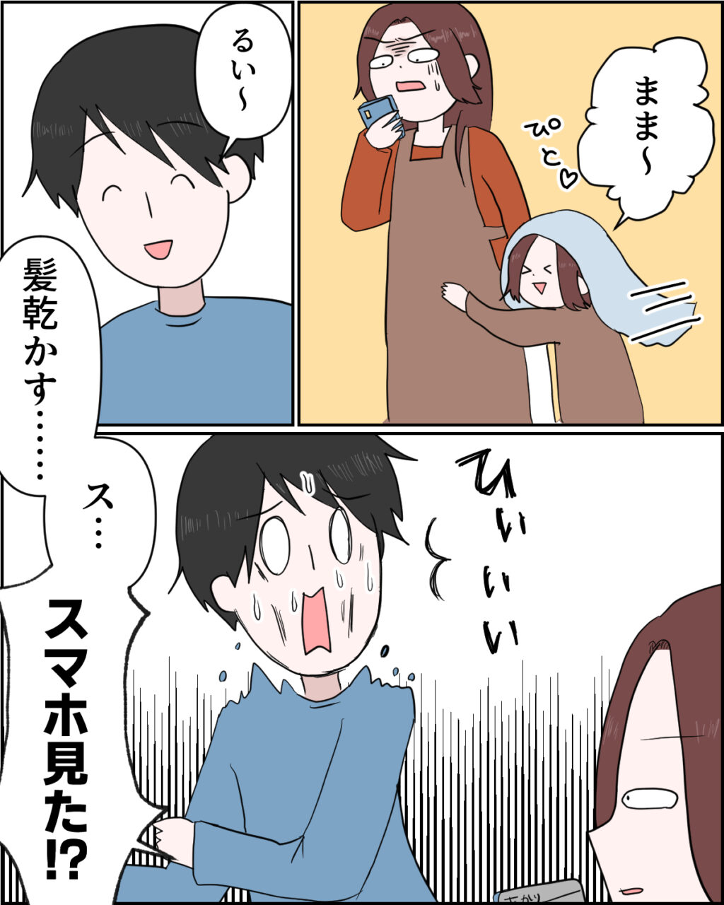 そのとき、お風呂を出た瑠衣が「まま~」と走って来て私にくっついてきました。「るい~、髪乾かす・・」と言いながら後から部屋に入ってきた謙介は、私が謙介のスマホを手に固まっているのを見て「ス・・スマホ見た!?」と大慌て。