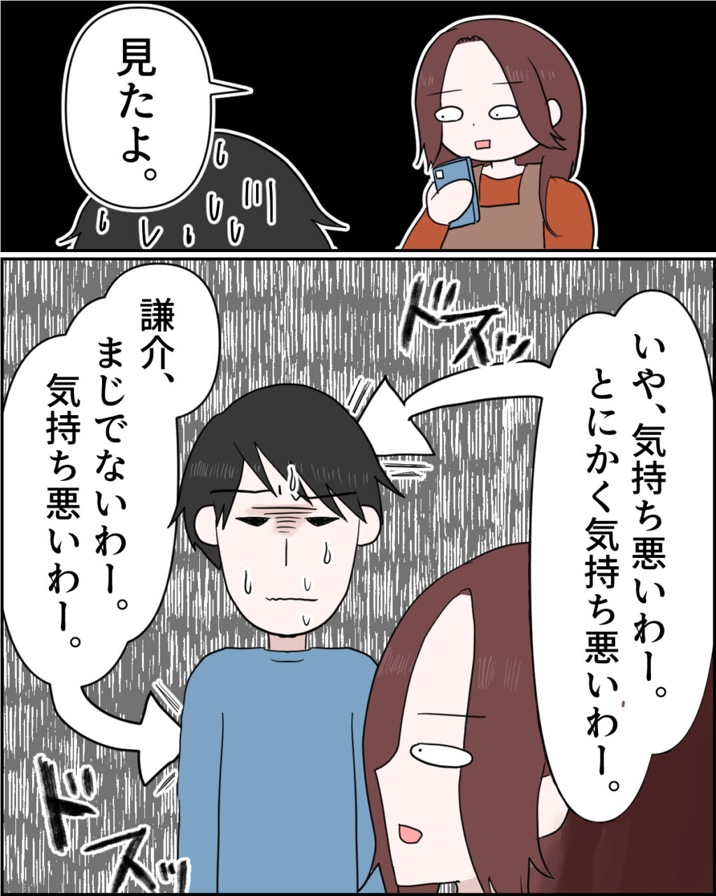 私は動じることなく「見たよ」と返し、真顔で「いや、気持ち悪いわー。とにかく気持ち悪いわー。謙介、まじでないわー。気持ち悪いわー」と淡々と言いました。