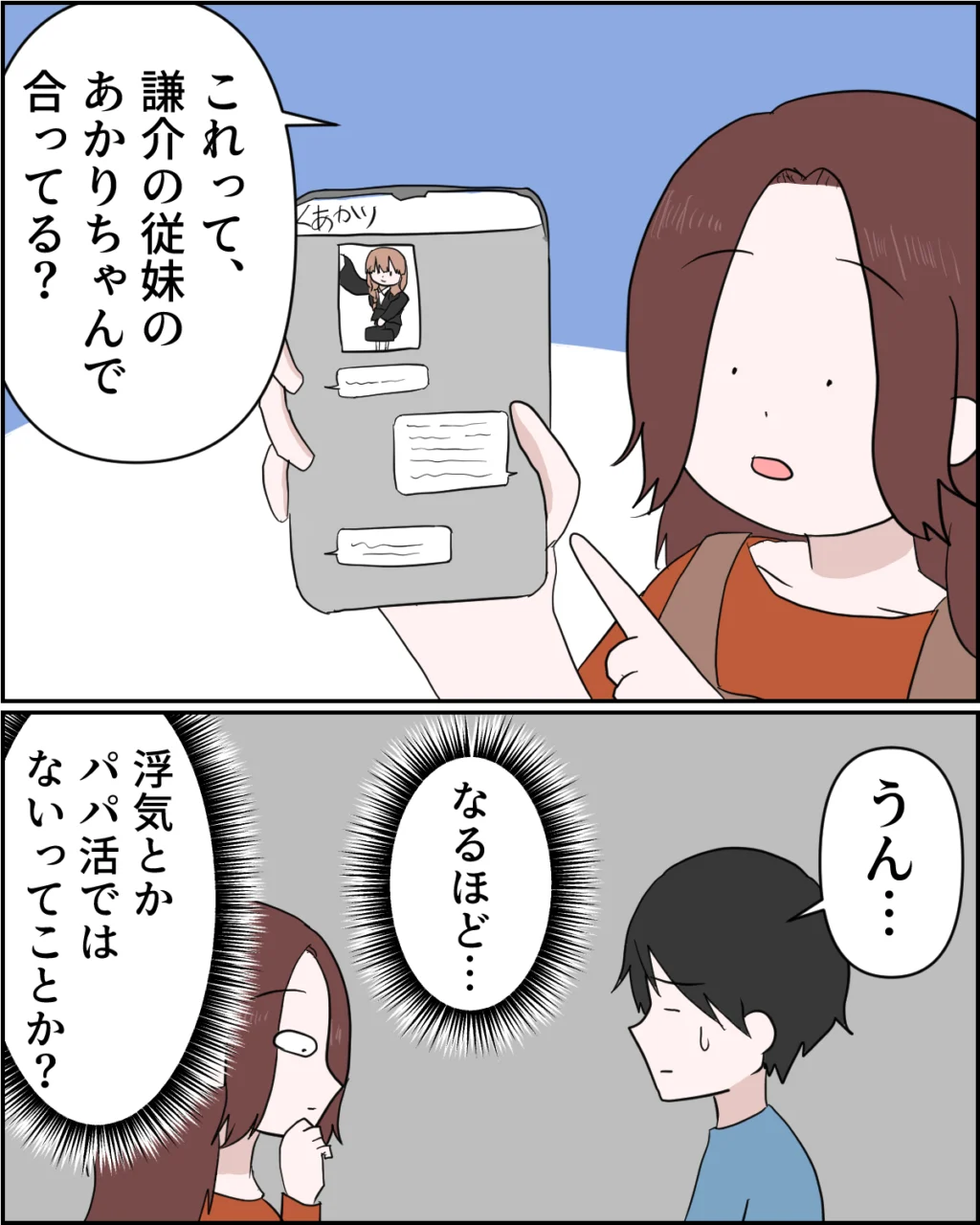 そして、謙介に送られてきた画像を指さして「これって、謙介の従妹のあかりちゃんで合ってる?」と聞くと、力なく「うん・・」と認めた謙介。なるほど・・浮気とかパパ活ではないってことか?と一応納得した私ですが、