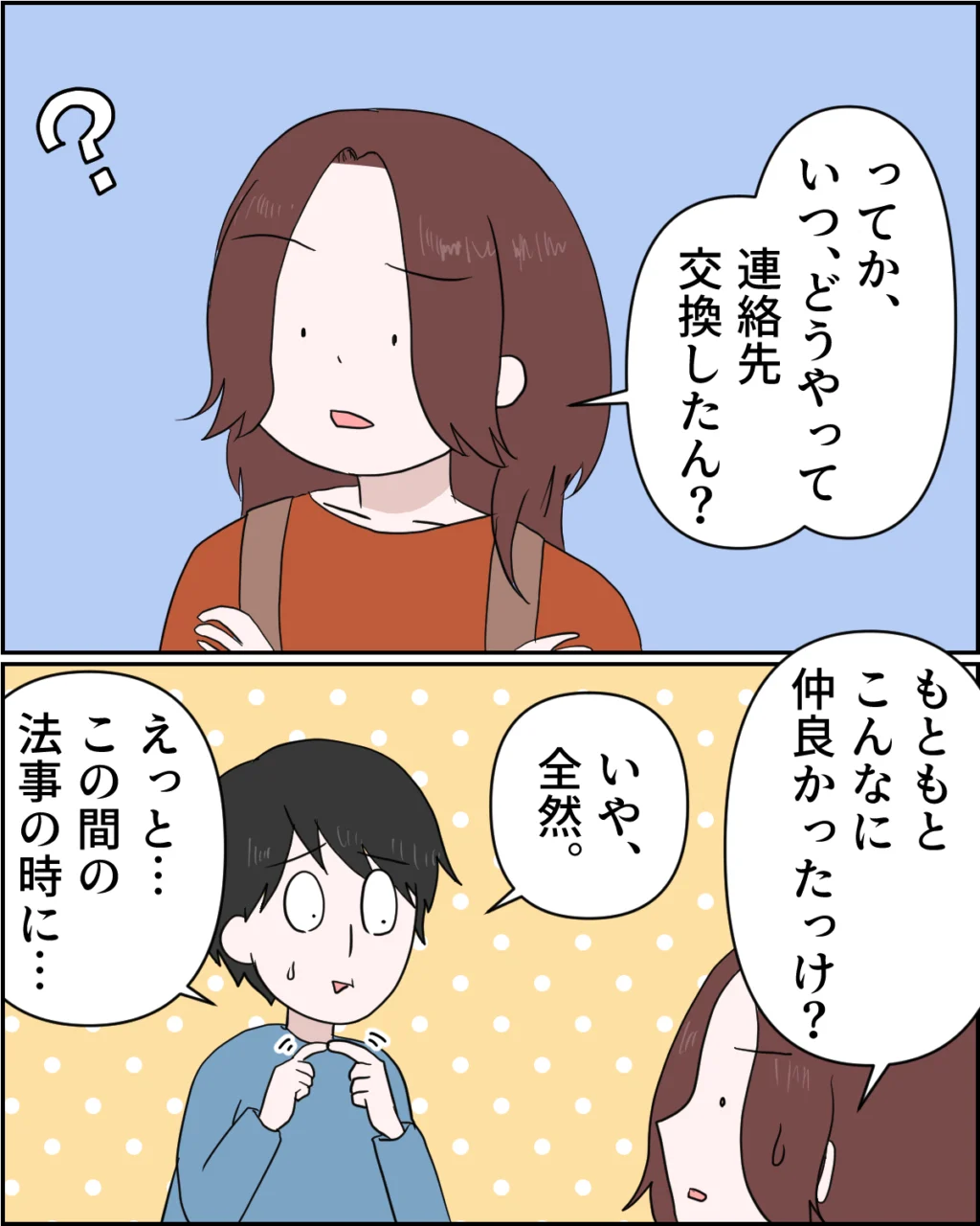 「ってか、いつ、どうやって連絡先交換したん?もともとこんなに仲良かったっけ?」と不思議に思って聞いてみました。私の知る限り、謙介があかりちゃんと会う機会はほとんどなく、それほど親しくはなかったはずです。すると、「いや、全然。えっと・・この間の法事の時に・・」とあかりちゃんと連絡先を交換した経緯を謙介が気まずそうに話し始めました。