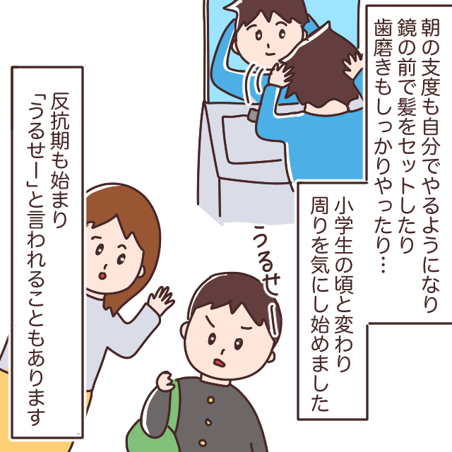 朝の支度も自分でやるようになり、鏡の前で髪をセットしたり、歯磨きも念入りにしたりと、小学生の頃とは違って少しずつ周りを気にするようになりました。反抗期も始まり、「うるせー」なんて言われることも増えましたが、生意気になった分、ちゃんと成長している証拠だと目をつぶっています。