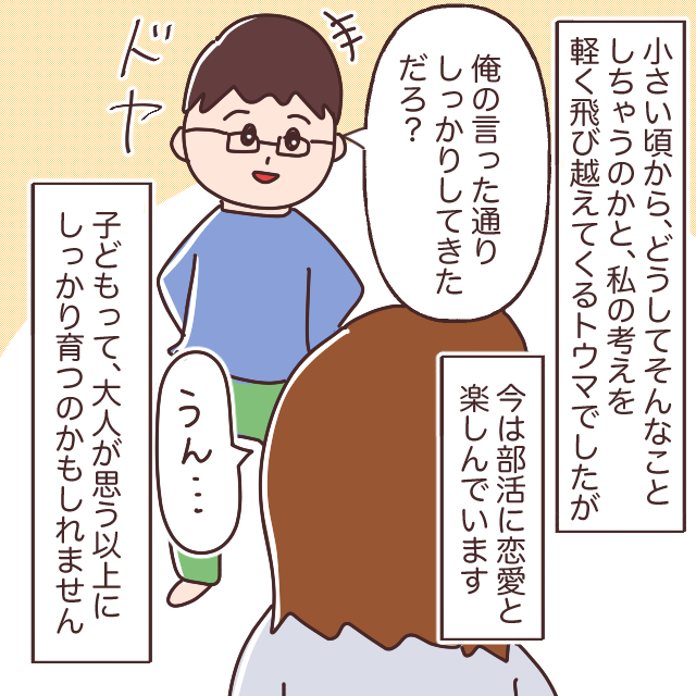 小さい頃から、「どうしてそんなことするの?」と、いつも私の想像を軽々と飛び越えてきたトウマ。そんな彼も今では、部活に恋愛にと毎日を楽しんでいます。子どもって、大人が思う以上にしっかり育つのかもしれません。悔しいけれど、夫の言った通りになりました。