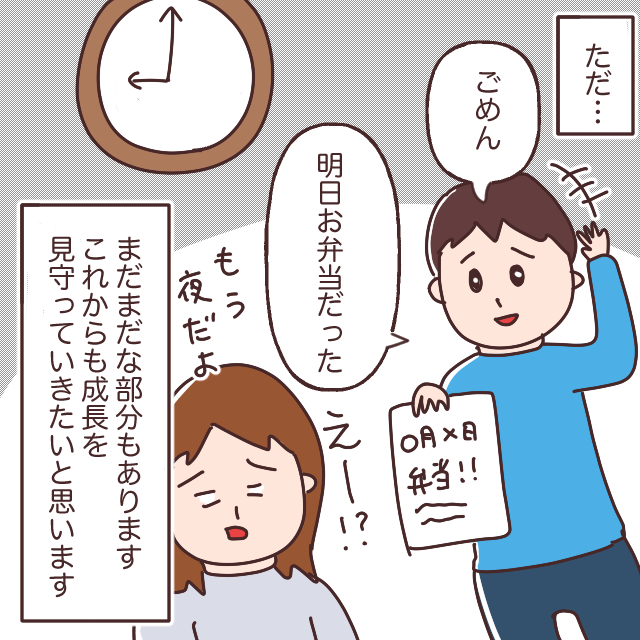 とはいえ、まだまだ手がかかるところもあります。この前なんて夜9時になってから「ごめん、明日お弁当だった」なんて言われて、しっかり振り回されました。それでも、そんなところも含めて成長途中。これからもゆっくり見守っていきたいと思います。
