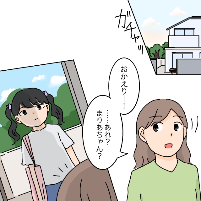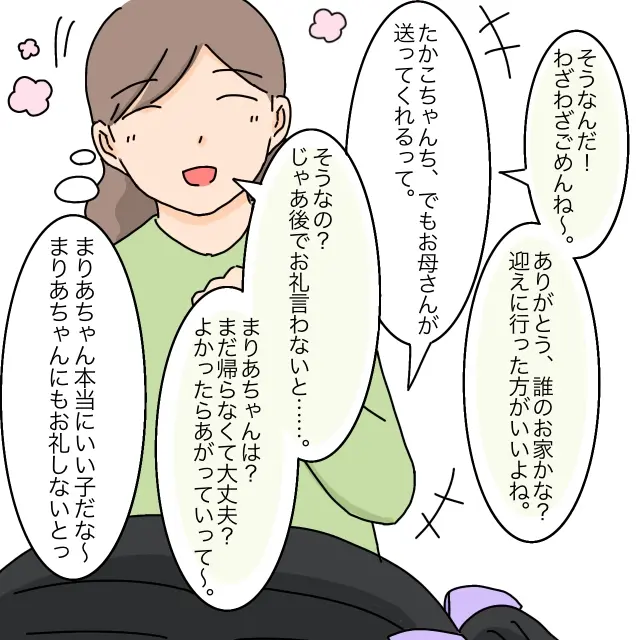 「そうなんだ!わざわざごめんね~誰のお家かな?迎えに行った方がいいよね」そう聞くと、まりあちゃんは「たかこちゃんち、でもお母さんが送ってくれるって」と答えます。私は、あいが帰ってくるまでまりあちゃんと一緒に家で待つことにしました。
