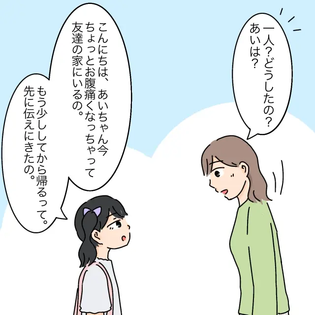 てっきりあいも一緒に帰ってきたのだと思いましたが、姿がありません。「1人?どうしたの?あいは?」とたずねると、まりあちゃんは落ち着いた様子で、「あいちゃん今ちょっとお腹痛くなっちゃって友達の家にいるの、もう少ししてから帰るって先に伝えにきたの」と親切に教えてくれました。