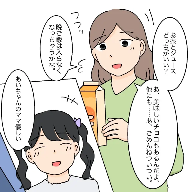 「お茶とジュースどっちがいい?美味しいチョコもあるんだよ、他にも・・・あ、でも晩ご飯入らなくなっちゃうかな」いつもの癖で、あれこれ世話を焼きそうになりましたが時間が時間。晩ご飯のことを考えてジュースを引っ込めようとすると、まりあちゃんは「あいちゃんのママ優しい」と楽しそうに笑いました。