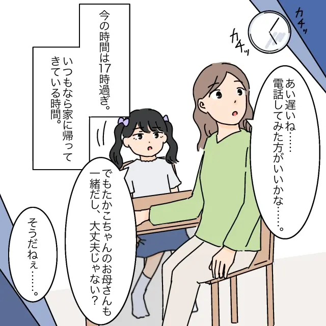 そんなことをしているうちに、時刻は17時過ぎ。いつもなら家に帰って来ている時間なので、少し心配になってしまいます。時計を見ながら「あい遅いね、電話してみた方がいいかな」とつぶやくも、まりあちゃんに「でもたかこちゃんのお母さんも一緒だし、大丈夫じゃない?」と言われ、もう少し待つことにしました。