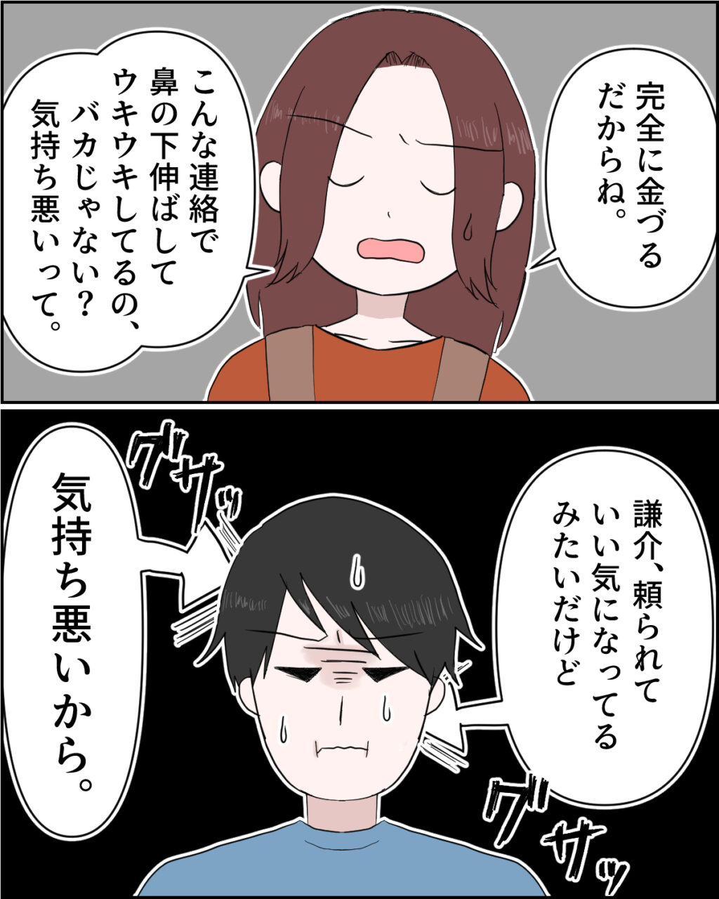 「完全に金づるだからね。こんな連絡で鼻の下伸ばしてウキウキしてるの、バカじゃない?気持ち悪いって」私の正論が謙介に突き刺さります。「謙介、頼られていい気になってるみたいだけど気持ち悪いから」何も言い返せない謙介に次々と向けられる刃。