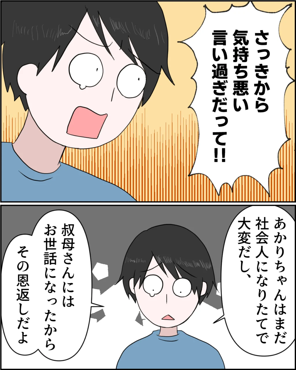 すると、「さっきから気持ち悪い言い過ぎだって!!」と半泣き状態の謙介が「あかりちゃんはまだ社会人になりたててで大変だし、叔母さんにはお世話になったからその恩返しだよ」と力なく反論すると、