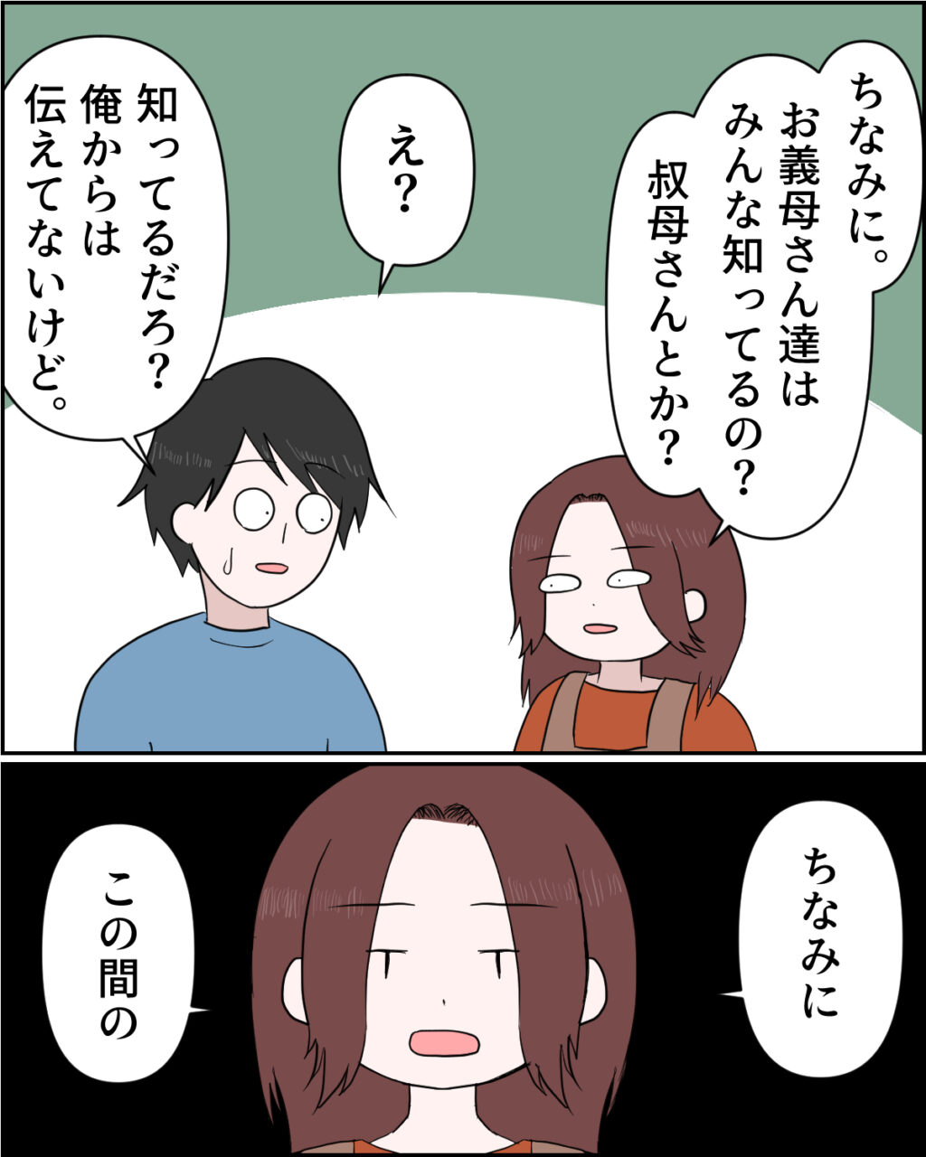 「ちなみに。お義母さん達はみんな知ってるの?叔母さんとか?」私の鋭い指摘に、謙介は「え?知ってるだろ?俺からは伝えてないけど」と答えました。