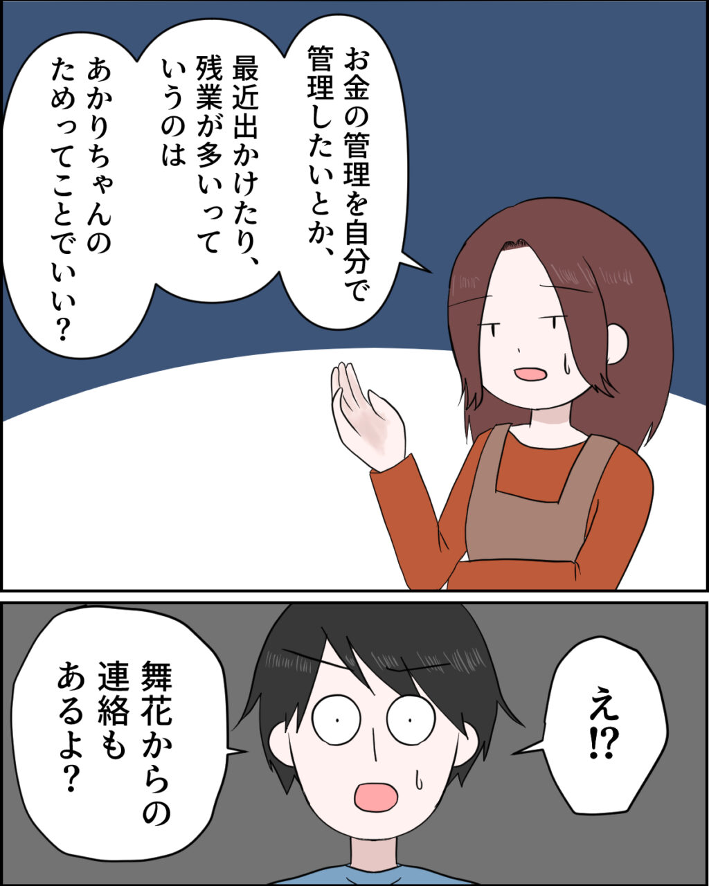 私は謙介に「ちなみにこの間の、お金の管理を自分でしたいとか、最近出かけたり、残業が多いっていうのはあかりちゃんのためってことでいい?」と事実確認。すると謙介は「え!?舞花からの連絡もあるよ?」と言い返してきました。