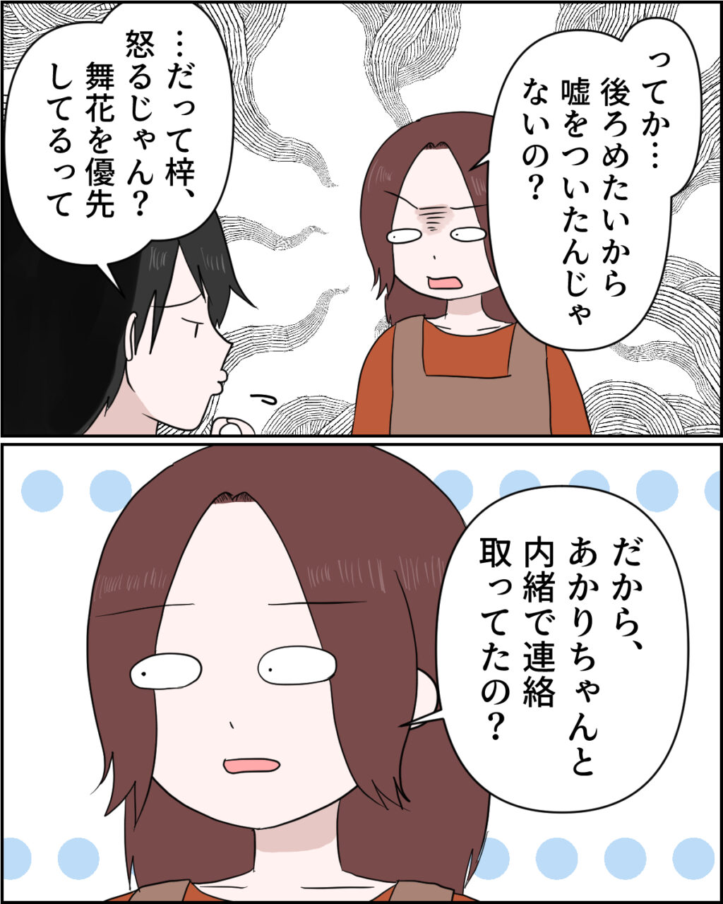 「ってか・・後ろめたいから嘘をついたんじゃないの?」と疑わしい目つきで謙介を見る私。「・・だって梓、怒るじゃん?舞花を優先してるって」ともじもじしながら言う謙介に、「だから、あかりちゃんと内緒で連絡取ってたの?」とズバリたずねたのでした。