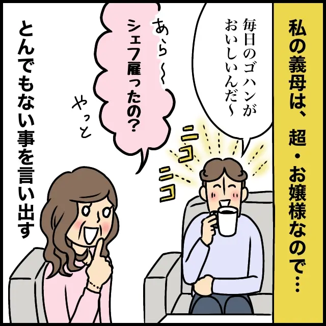 お嬢様育ちの義母の言動は浮世離れしています。この日も我が家に遊びに来てくれた義母に夫が「毎日のごはんが美味しいんだ~」と私の料理を褒めてくれているのを聞いて、「あら~、やっとシェフ雇ったの?」と、さらりととんでもないことを言いだします。もちろん悪気なんてこれっぽっちもありません。