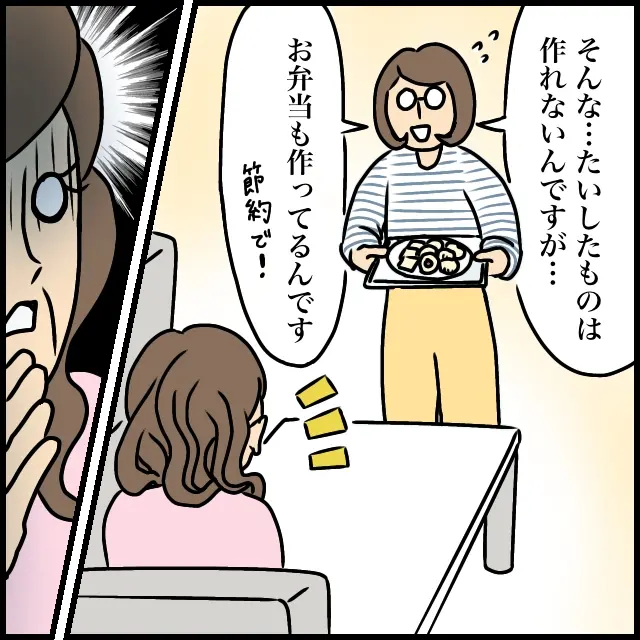 目の前で夫に褒められた私は嬉しさと恥ずかしさで「そんな、たいしたものは作れないんですが」と謙遜しつつ、節約のためにお弁当も作っていることを義母に伝えました。ちょっと自慢したい気持ちもあったのは正直なところ。義母は私の発言を聞いて驚いたように黙ってしまいました。