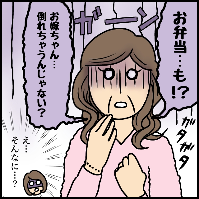 義母は青ざめて「お弁当・・・も!?」と繰り返しました。え、そんなにショック受ける?そう思っていると「お嫁ちゃん、倒れちゃうんじゃない?」と震えた声で義母が言うので、いったいどんなお弁当を想像しているのだろうとむしろ興味がわきました。まさか3段の桐の重箱の立派なお弁当を想像していたりして。クスっと笑いそうになったその時。