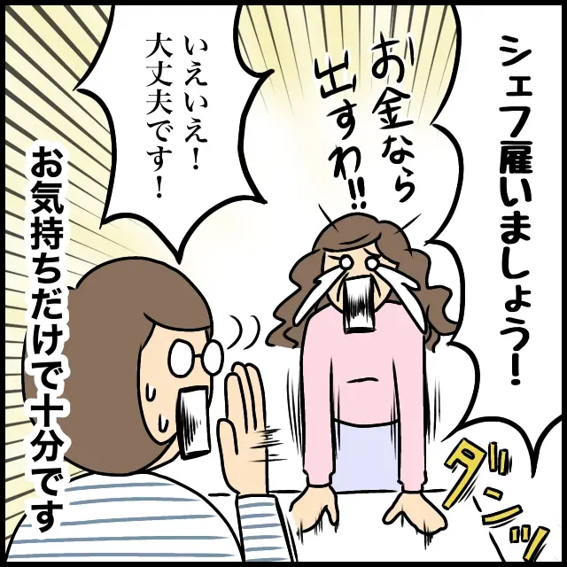 義母は真剣でした。「シェフ雇いましょう!お金なら出すわ!!」と涙ながらに言うので慌てて「いえいえ!大丈夫です!」と言い、納得してもらうまで大変でした。お義母さん、本当に、お気持ちだけで十分です。