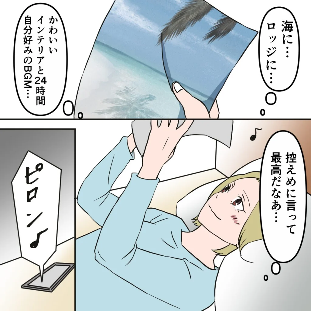 「海にロッジに・・かわいいインテリアと24時間自分好みのBGM・・控えめに言って最高だなあ・・」そう思いながら旅行先のパンフレットを眺めているとメッセージの通知音が。