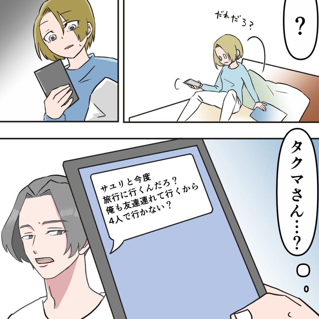誰だろうとスマホを見ると、「サユリと今度旅行に行くんだろ?俺も友達連れて行くから4人で行かない?」とタクマさんからのメッセージでした。