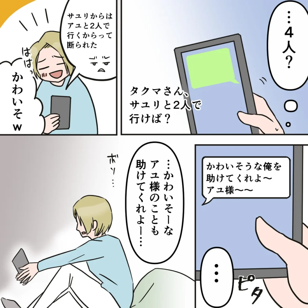 「・・4人?」そう思いながら「タクマさん、サユリと2人で行けば?」と返信すると、「サユリからは『アユと2人で行くから』って断られた」と嘆くタクマさん。思わず「ははっかわいそ(笑)」と呟いていると、「かわいそうな俺を助けてくれよ~アユ様~~」とタクマさん。そのメッセージをじっと見つめながら、「・・かわいそーなアユ様のことも助けてくれよー・・」とやるせない思いがこみ上げてきました。