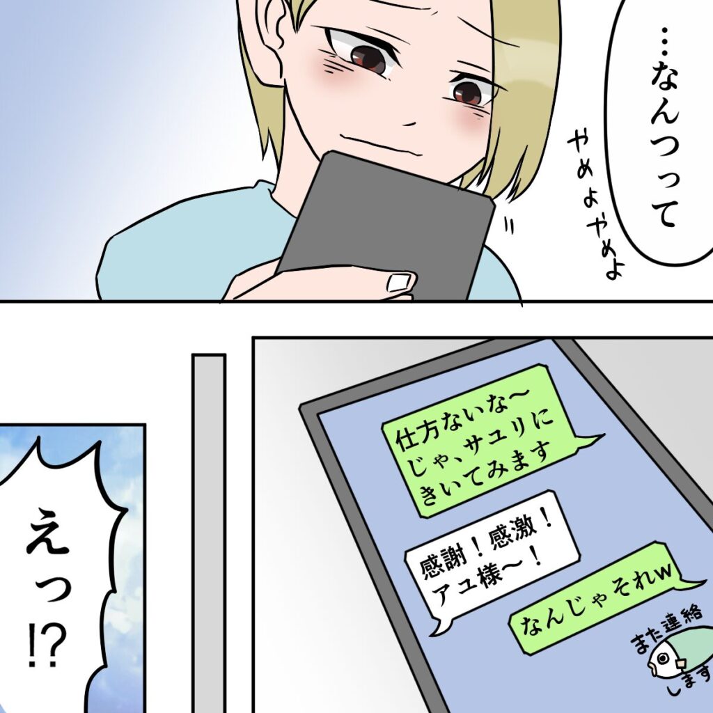 でもすぐに「・・なんつって。やめよやめよ」と気持ちを切り替えた私は、「仕方ないな~。じゃ、サユリにきいてみます」と返信。するとすぐにタクマさんから「感謝!感激!アユ様~」と返信が届き、「なんじゃそれw」と突っ込みを入れたのでした。