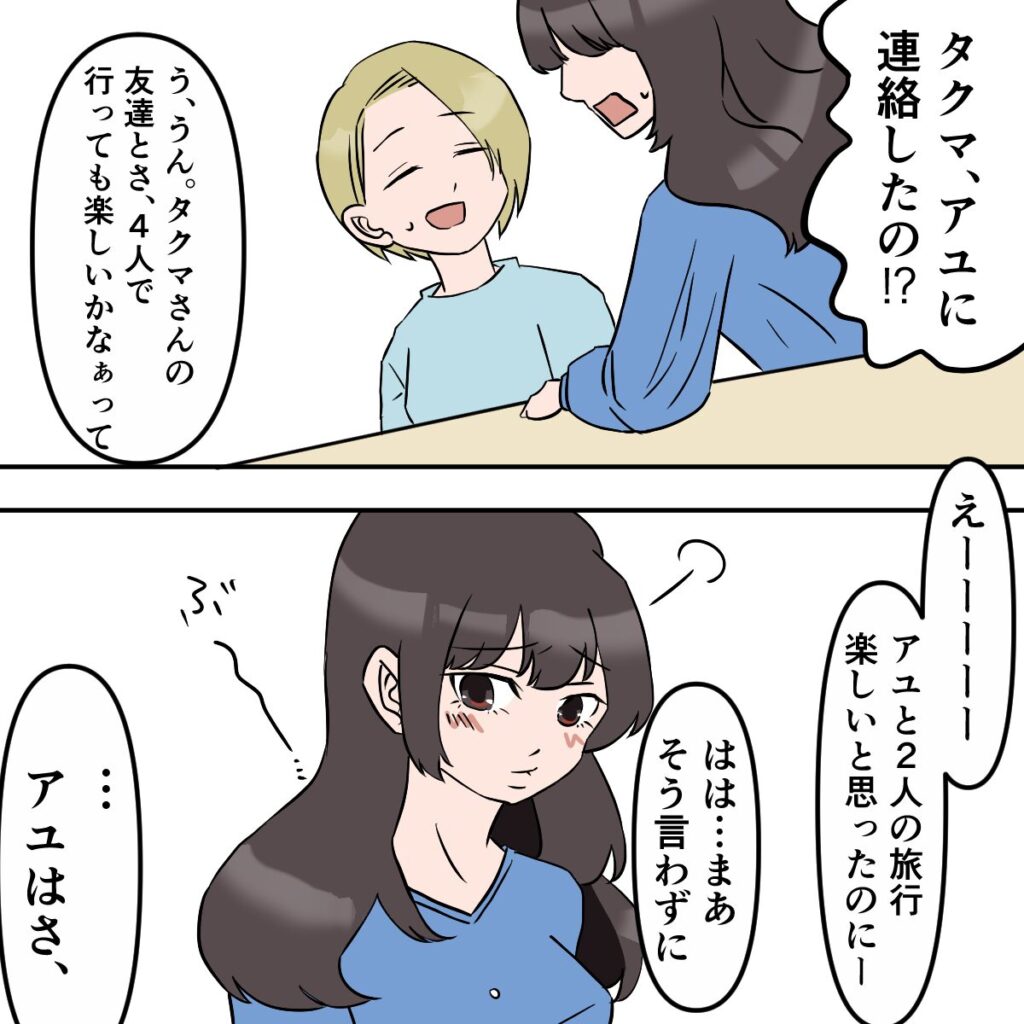 その後、「えっ!?タクマ、アユに連絡したの!?」と怒り出すサユリに、「う、うん。タクマさんの友達とさ、4人で行っても楽しいかなぁって」私がそう答えると、「えーーーーアユと2人の旅行楽しいと思ったのにー」ふくれっ面をするサユリ。私は「はは・・まあそう言わずに」と彼女をなだめます。