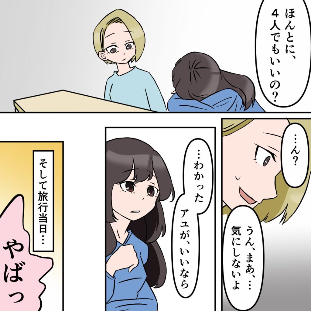 サユリさんとの2人旅行を楽しみにしていたアユさん、タクマさんに頼まれると嫌とは言えないのは、きっとサユリさんと付き合い始めたと知っても好きだという気持ちがあるから・・。タクマさんの友達も加わった4人の旅行、一体どんなことが起きるのでしょうか。