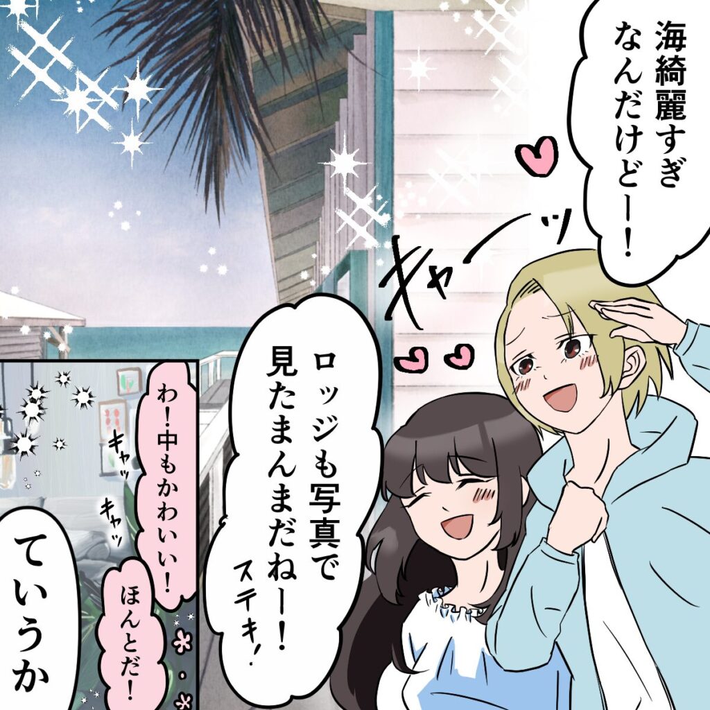 「キャーーッ海綺麗すぎなんだけどー!」とはしゃぐ私に「ロッジも写真で見たまんまだねー!ステキッ!」とサユリも大はしゃぎ!そして部屋に入ると、「わ!中もかわいい!」「ほんとだ!」とパンフレット通りの素敵さに大満足する私たちなのでした。