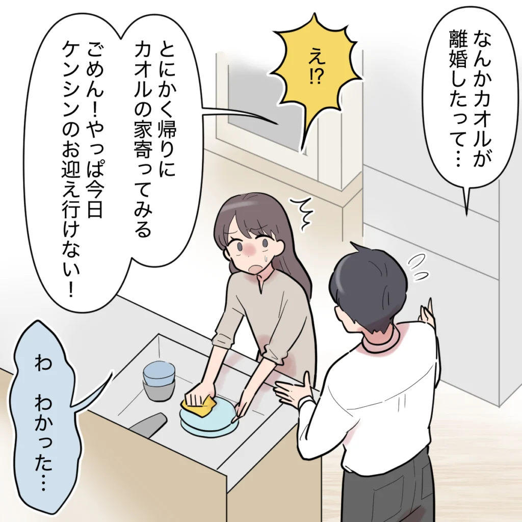 シンジから「カオルが離婚したらしい」と聞かされ、私は思わず言葉を失います。彼もつい先ほど知ったようで、ひどく動揺している様子でした。詳しい話を聞くため、シンジは仕事帰りにカオルさんの家へ寄ることに。ケンシンのお迎えは私が代わりに行くことになりました。