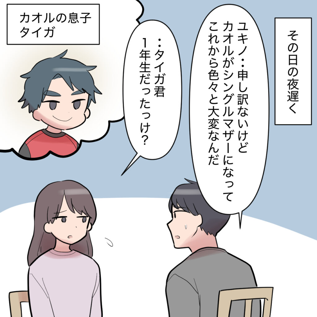 その日の夜遅く。カオルさんの家から戻ってきたシンジに、これからどうするつもりなのかをたずねました。カオルさんには小学1年生の息子タイガ君がいます。シングルマザーになった妹を支えるため、シンジはこれからカオルさんに協力していくつもりのようでした。