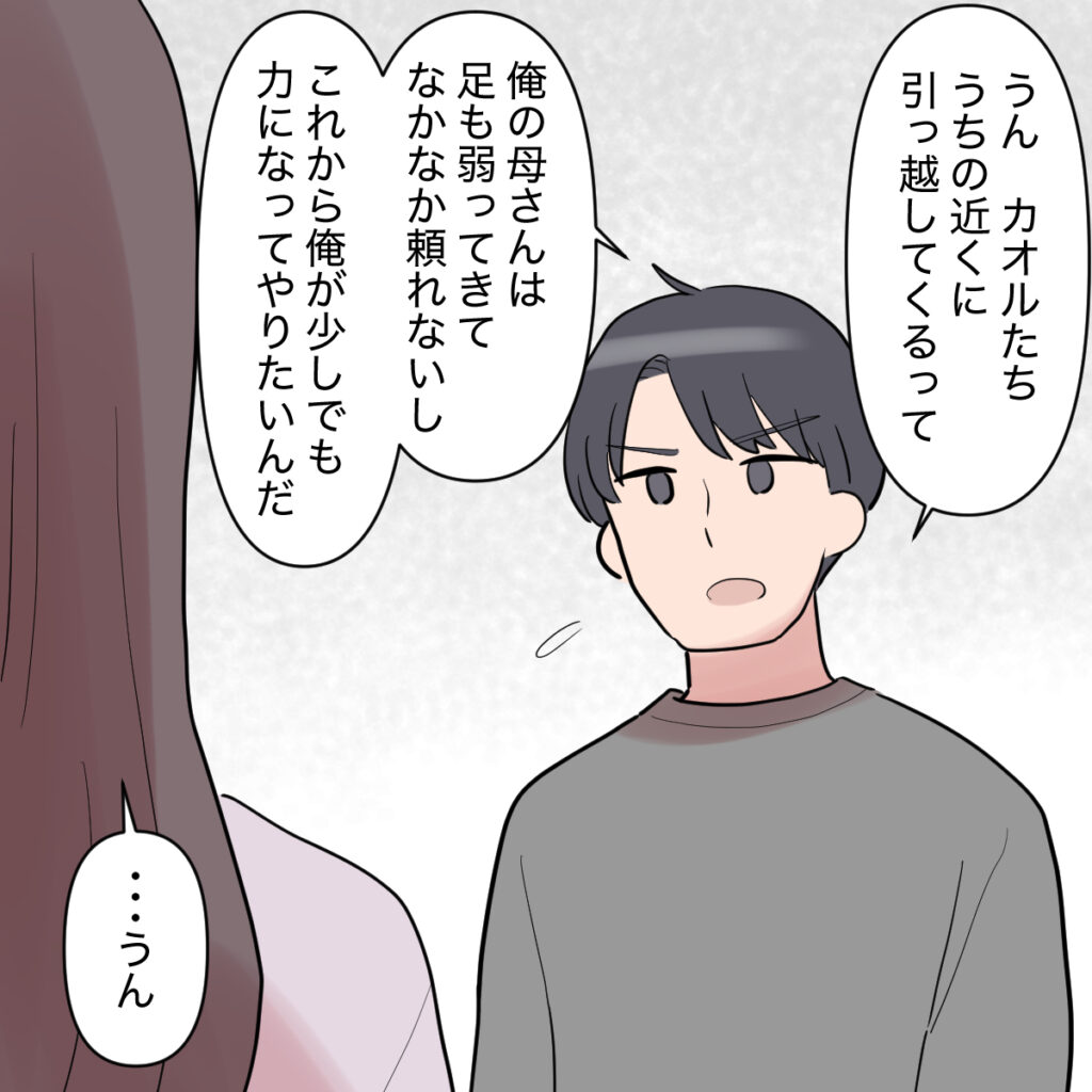 「カオルたち、うちの近くに引っ越してくるって・・・俺の母さんは足も弱ってきてなかなか頼れないし、これから俺が少しでも力になってやりたいんだ」まっすぐな目でそう話すシンジ。私はとてもじゃないけれど、反対の言葉を口にすることができませんでした。