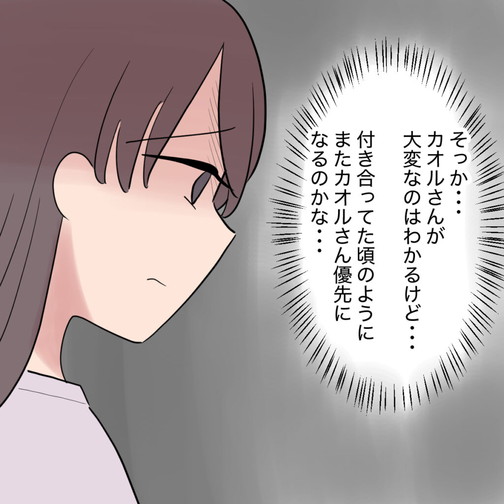 カオルさんがシングルマザーとして大変な状況にあることは分かっているつもりです。だけど、付き合っていた頃のようにまた彼女が最優先になるのではないかと思うと、気分が落ち込みます。ようやく私たちの人生を歩めると思っていたのに・・・。