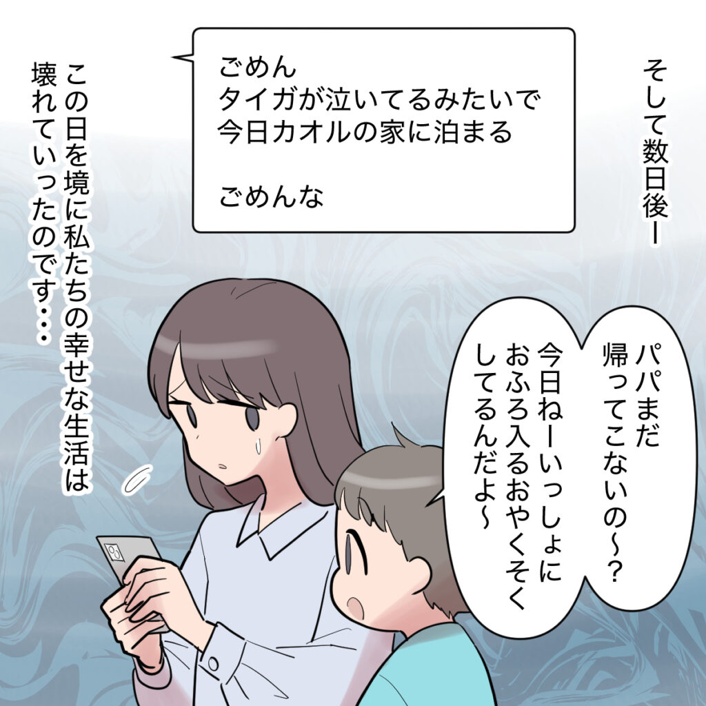 その日から、シンジは再びカオルさんを優先するようになりました。タイガ君が泣いているからと、カオルさんの家に泊まることも増えていきました。パパが大好きなケンシンは、「パパまだ帰ってこないの?今日一緒にお風呂入るお約束してるんだよ」と寂しそう。何と説明すればいいのか分からず、私は申し訳ない気持ちでいっぱいになりました。
